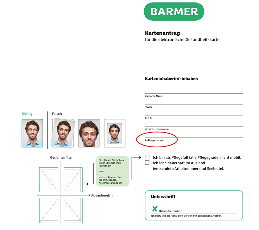 Die Auftragsnummer finden Sie auf dem Kartenantrag für die elektronische Gesundheitskarte oben links unterhalb der persönlichen Daten.